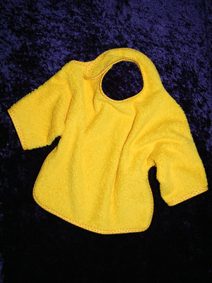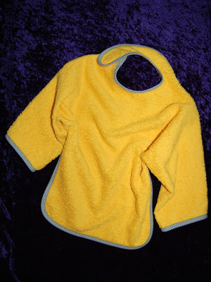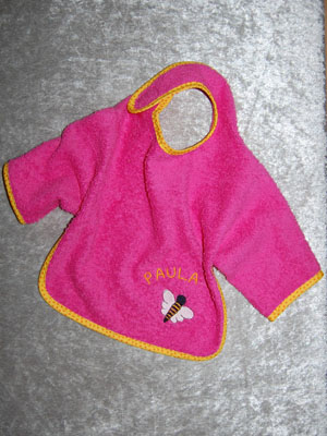 Hier finden Sie Frottee-Lätzchen aus eigener Fertigung mit Ärmeln und Klettverschluß in zwei Größen. Teilweise auch mit passenden Waschlappen.