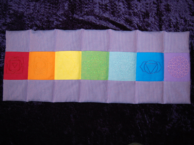 Wärmekissen aus vorgewaschenen Stoffen der Firma Westfalenstoffe (Farbvariante beinhaltet auch Stoffe anderer Hersteller), bestickt mit Chakrasymbolen und mit Raps gefüllt, sind sowohl für Wärmeanwendungen als auch für Kälteanwendungen geeignet. Zum Erwärmen legen Sie das Kissen einfach in die Mikrowelle (1 Minute bei 440 Watt reicht meist schon) oder den Backofen bis die gewünschte Temperatur erreicht ist. Lieferzeiten für individuelle Anfertigungen nach Vereinbarung.
